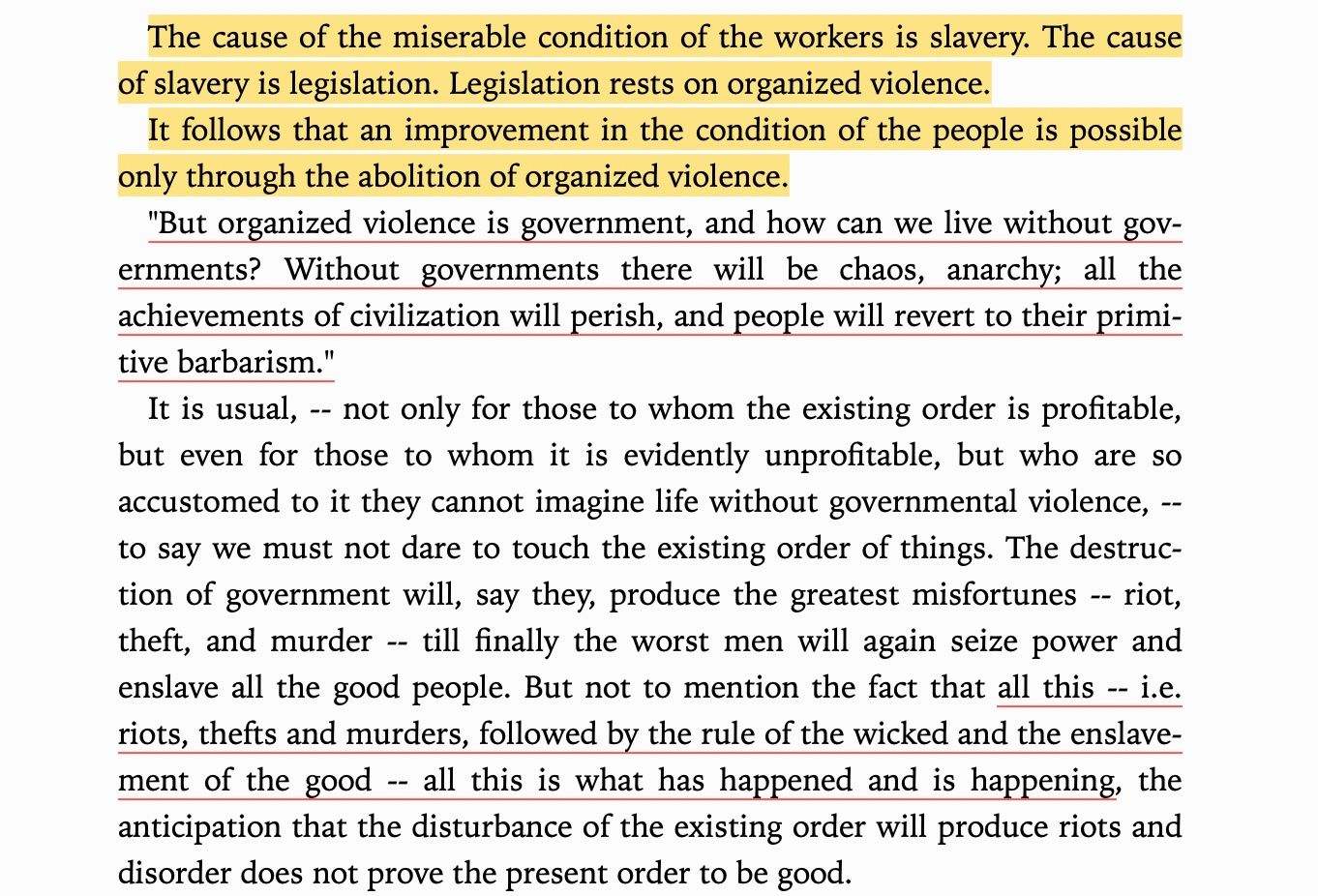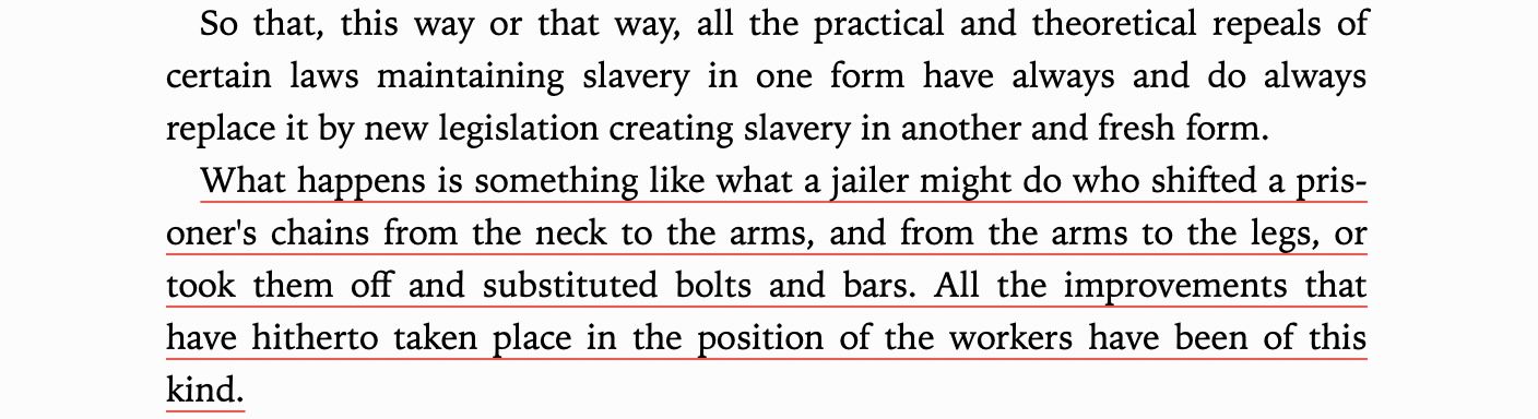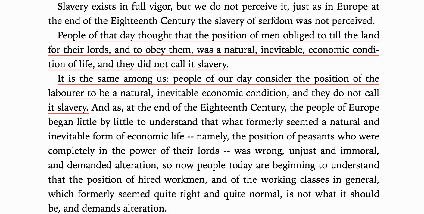 To him slavery is wage slavery is wage slavery, slaving over agricultural land, this is the title of his (short) book, The Slavery Of Our Times. As he lays out, the form of slavery just keeps morphing, from chattel slavery to serfdom to wage slavery to, like, the gig economy now. We keep changing laws but not changing the condition because laws are the cause of the problem, not the cure.