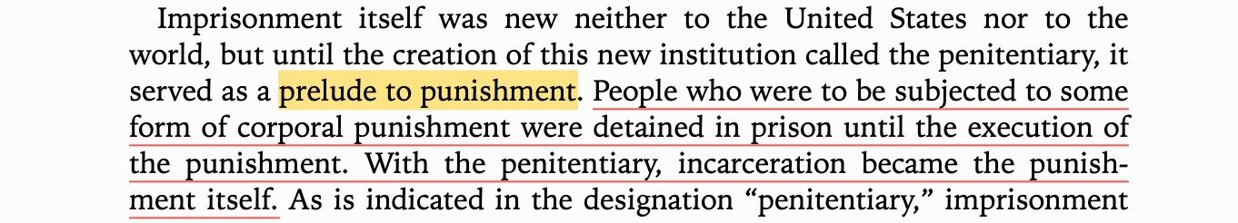 As Angela Davis writes, prisons were where you kept someone before torturing and murdering them. The only innovation that distinguishes us from Hammurabi is that we've taken this appetizer and made it the main course.