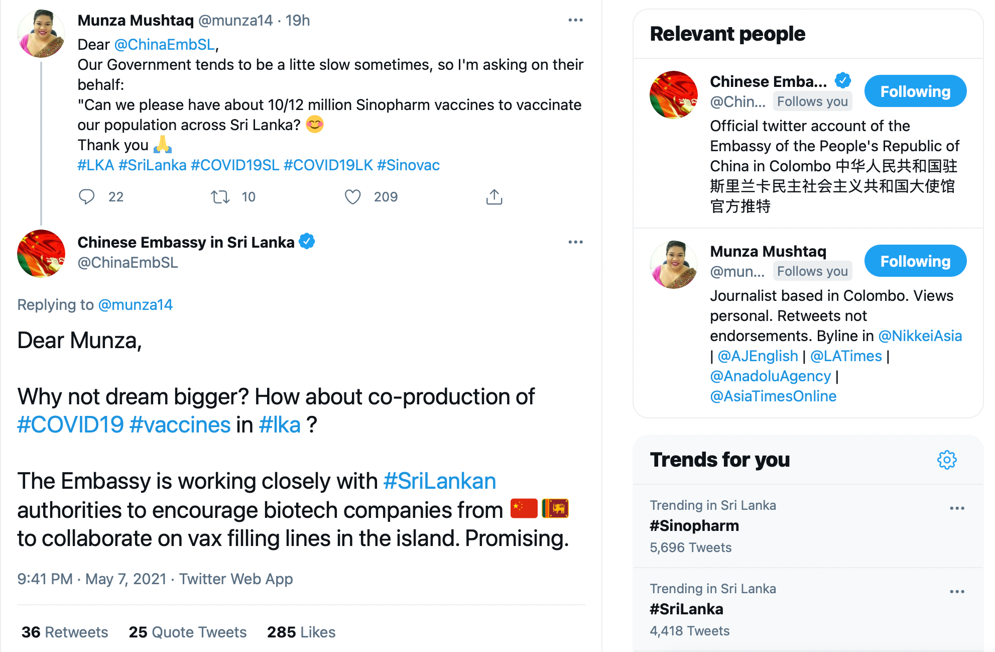 Let's start with a literal example of vaccine diplomacy. This is the Chinese Embassy talking to a Sri Lankan journalist, Munza Mushtaq.