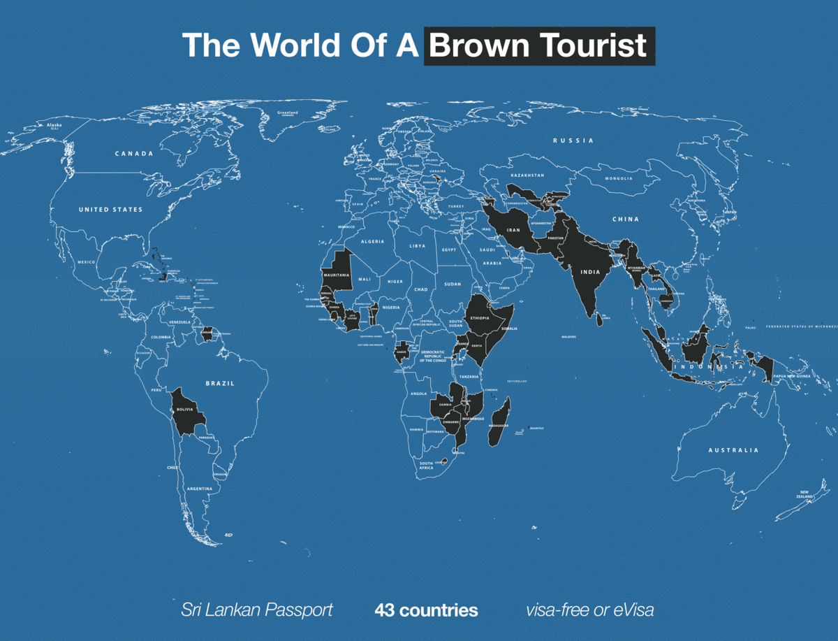 Palestinians live under very obvious apartheid (different buses, roads, IDs, and rights), but you in the global majority, look at your own passport. Are we not also completely fucked? Just look at the world of a white tourist (with a Canadian passport) and someone with a Sri Lankan passport. Look how much they limit our God-given freedom to move.