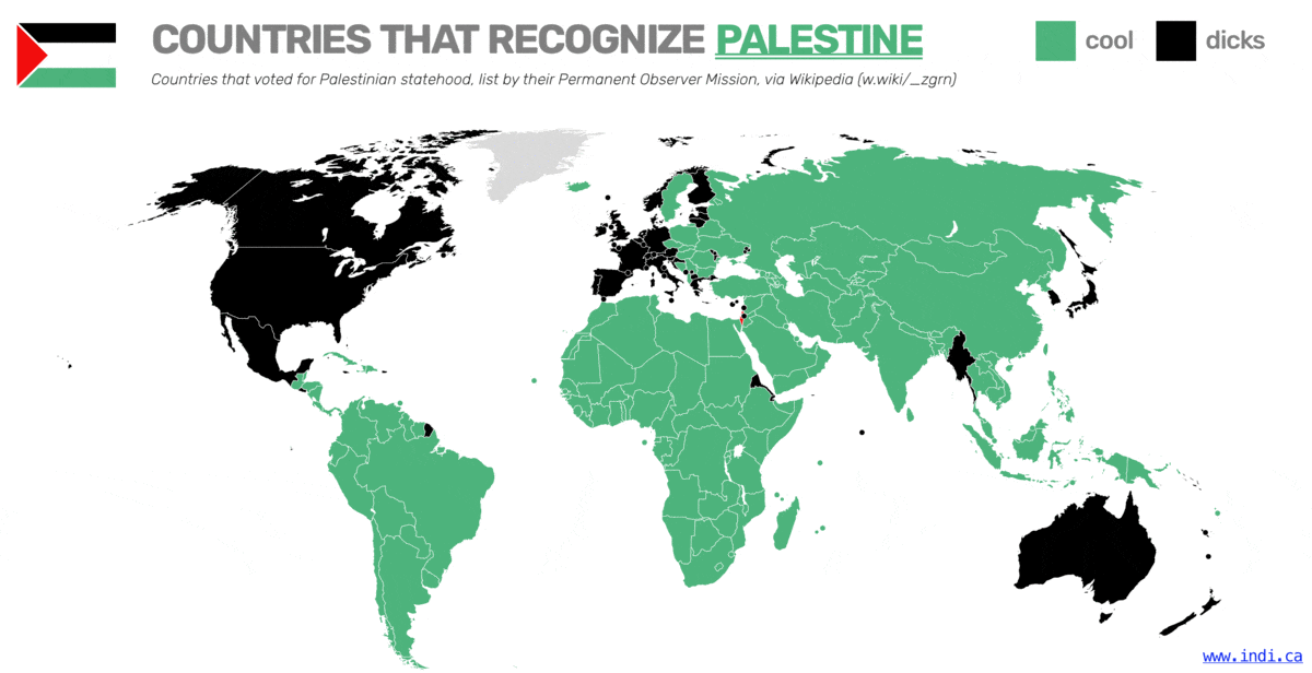 The people in black talk about a two-state solution but that's bullshit. In action, they prevent Palestine from being a state. Then they sell Israel arms and give them diplomatic cover for genocide. For decades, they've been buying time for war crimes.