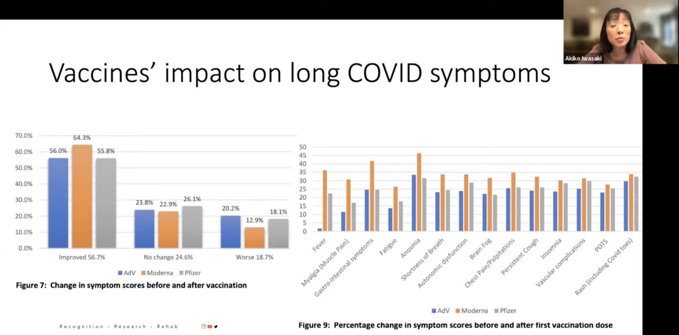 In this survey by the patient group Long COVID SOS (which is not a study), upwards of 60% who got vaccinated (after being sick) reported improvement. Patients have been reporting this effect for a long time and, as Iwasaki said, “The patients are the experts in their disease.”