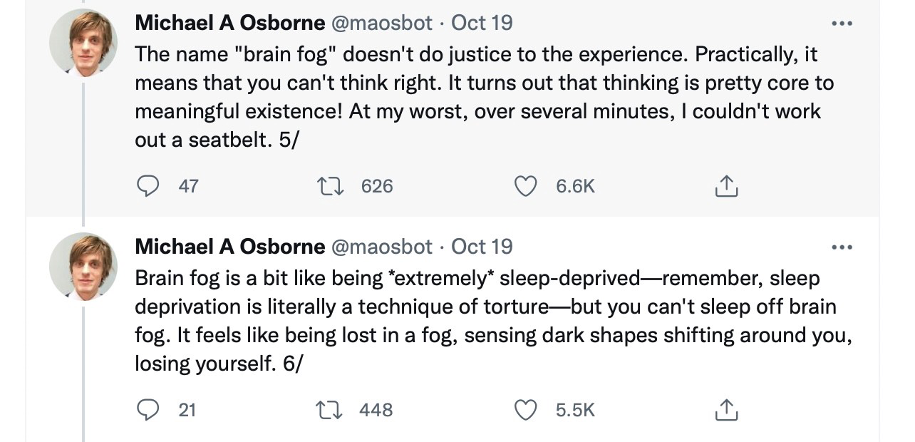 Another highly common symptom is the also easy to write-off ‘brain fog’. We might joke about this in normal life, but in clinical terms it means the most important organ in the human body is not working. As survivor Pennysays, “brain fog sucks dude ive had it since ive gotten covid and its even worse these days, my mind is constantly in a haze and I forget how to do the simplest things, its scary.”