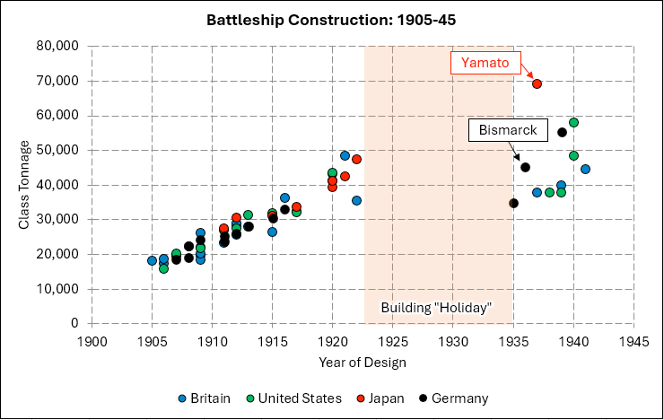 The allocation of total tonnage, combined with limits on the maximum tonnage of individual warships, synergized to create extremely transparent arithmetic governing the numbers of warships in the relevant fleet. Because battleships were capped at 35,000 tons of displacement, the 525,000 total tons allocated to the US and Royal Navies meant that they could possess fifteen large battleships each, while Japan’s 315,000 total tons allowed for nine. In order to come into compliance with the tonnage limits, both the British and the Americans were forced to scrap many of their older dreadnought and pre-dreadnought battleships, and the British had to conduct a redesign of their new Nelson-class to slim her down.