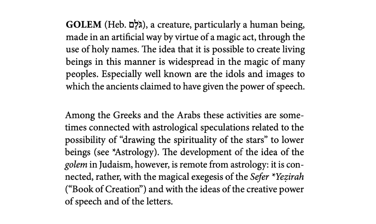 According to the Encyclopedia Judaica, a Golem is a person made in an artificial way.