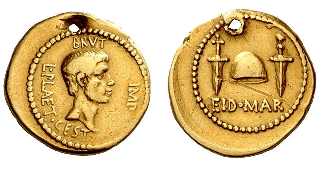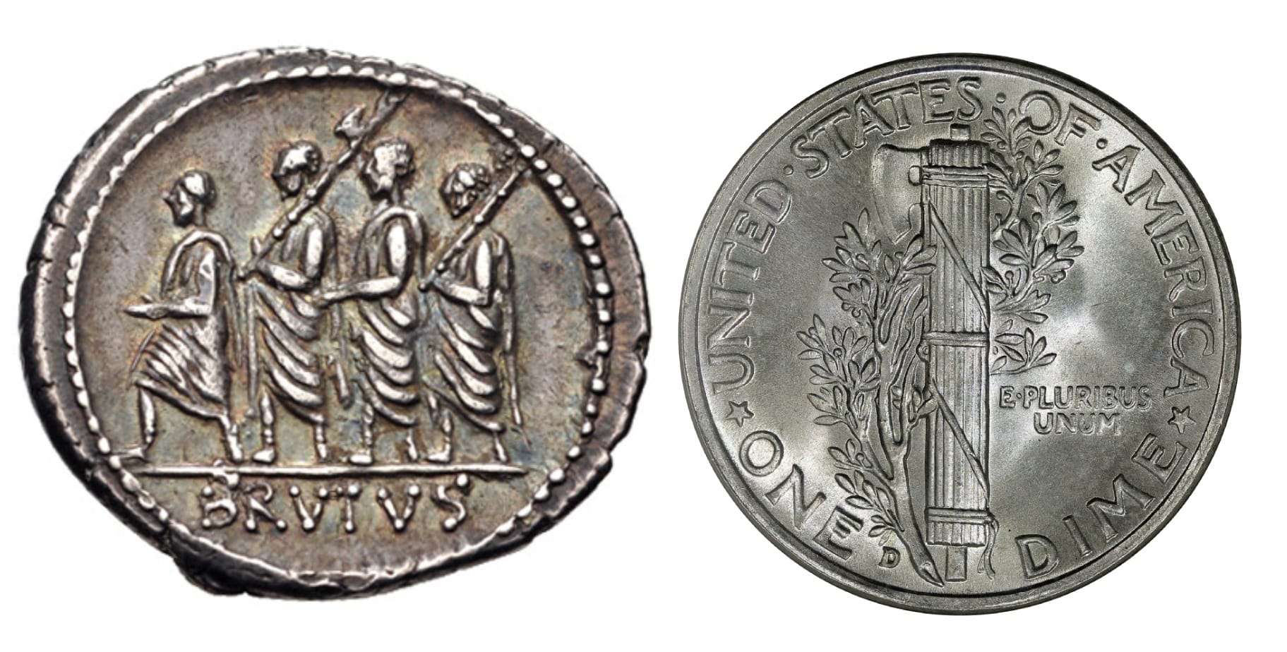 The Brutus coin shows the cap given to a freed slave, between two daggers for the kingslayers. But Brutus freed no slaves. He merely led a bunch of oligarchs in a petulant rebellion against a monarch, like American 'revolutionaries' did centuries later. It's all, as my historical thesis goes, same shit, different day.