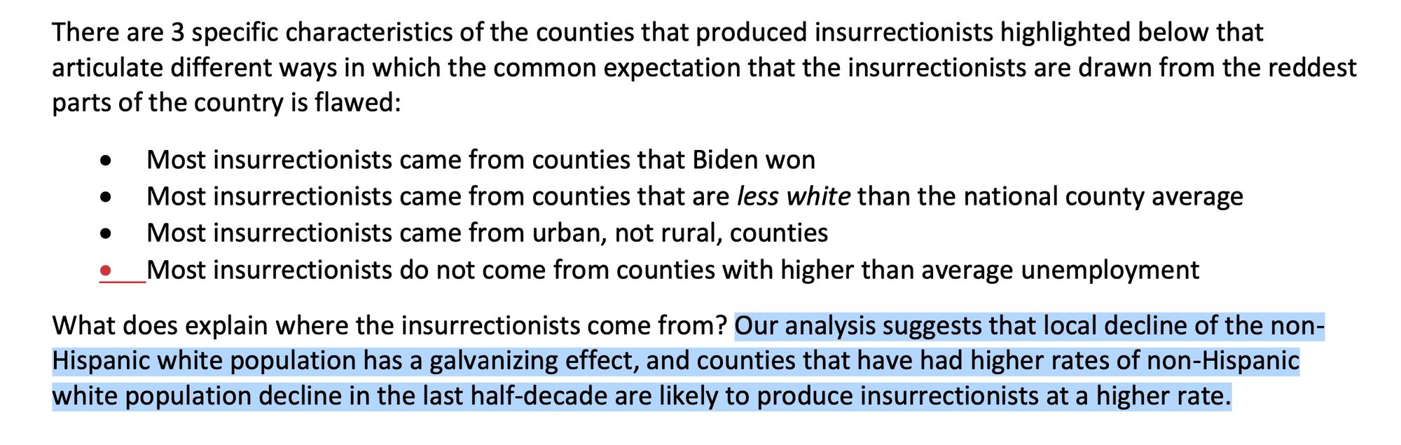 When analyzing who participated in the January 6th insurrection, Robert Pape et al found that "the key county characteristic is that the counties with insurrectionists lost the most non-Hispanic White population."