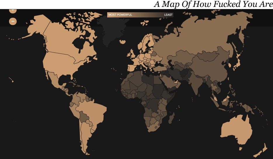 Behold this map of how fucked a dark passport holder is. It is really a map of colonialism. Were you a colonial country, or did you successfully genocide the natives? If so, congratulations, you can visit your former colonies as you please. The world is your #oyster. In the map these places are lighter colored, because white people.