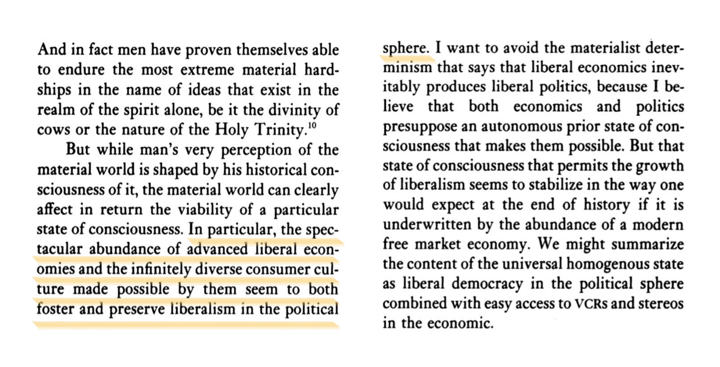 Fukuyama said “the material world can clearly affect the viability of a particular state of consciousness.” The sheer material splendor of Capitalism made it a compelling belief. Indeed, its materiality made it seem like not a belief at all.