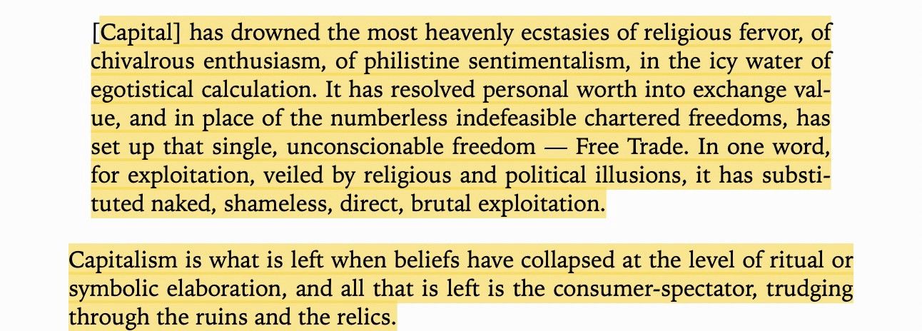 “Capitalism is what is left when beliefs have collapsed at the level or ritual or symbolic elaboration, and all that is left is the consumer-spectator, trudging through the ruins and the relics.”