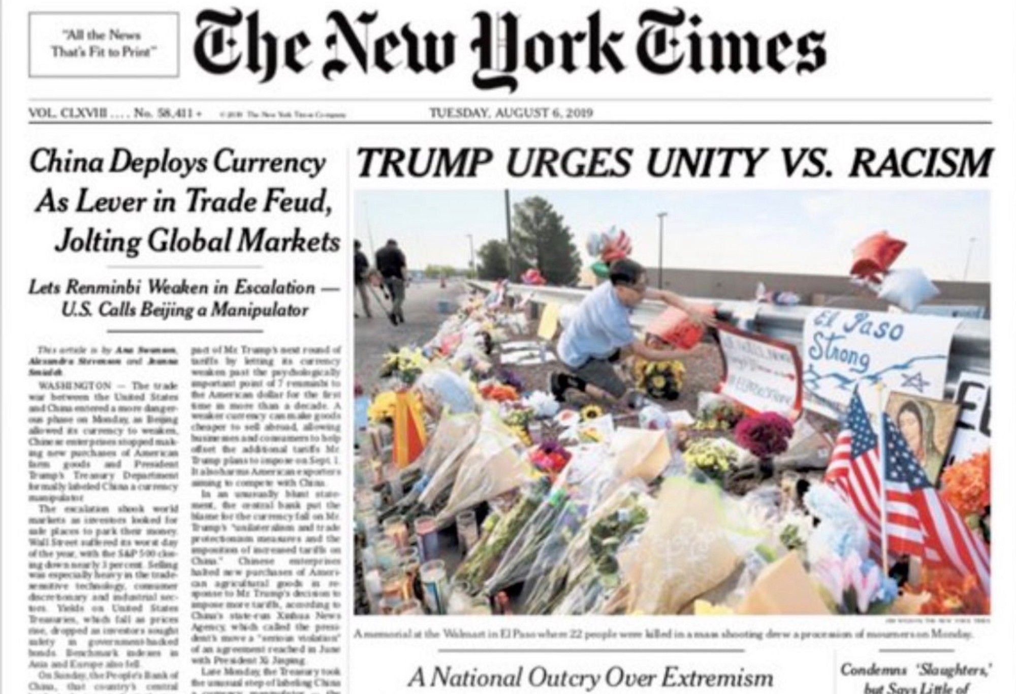 After racist mass murders inspired by Trump, the New York Times wrote that Trump urges unity. Trump who calls immigrants criminals and rapists, and who laughs as his facist rally crowds encourage killing people. Even people from the FBI refer to white supremacists terrorists as Trump’s base, but the New York Times thought this news was fit to print.