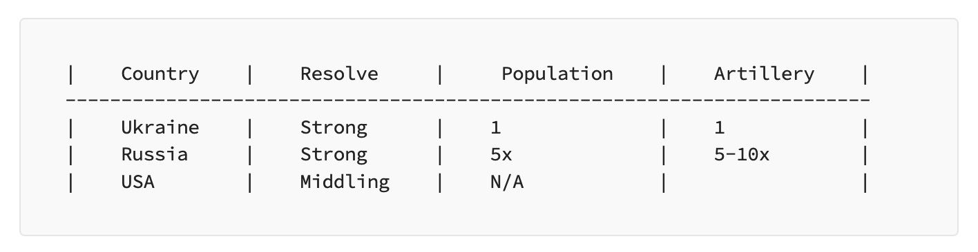 Population * Artillery * Resolve = Russia wins the Ukraine War.