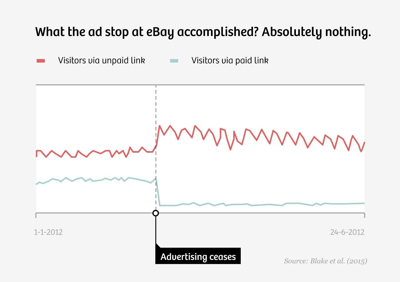 In 2011, Steve Tadelis got eBay ran this very experiment. As a test, eBay completely stopped search advertising. The marketing department was freaking out, but nothing happened. All of the traffic they were paying for just came for free. For every dollar eBay spent on search, it turned out that they were losing 63 cents.
