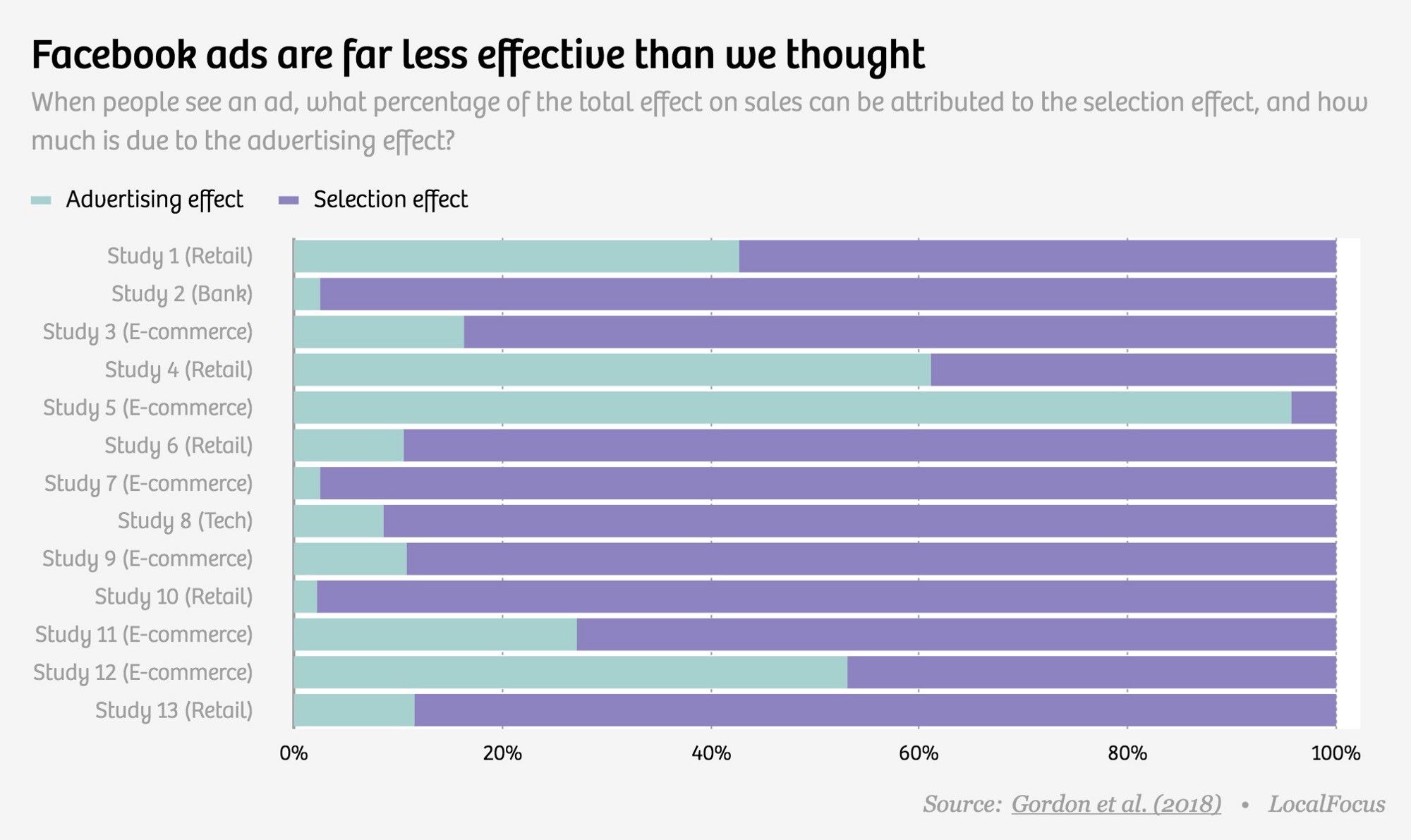 Economists working directly with Facebook ran experiments on selection effect vs. advertising effect. In most cases, selection effects were stronger, sometimes 50x more.