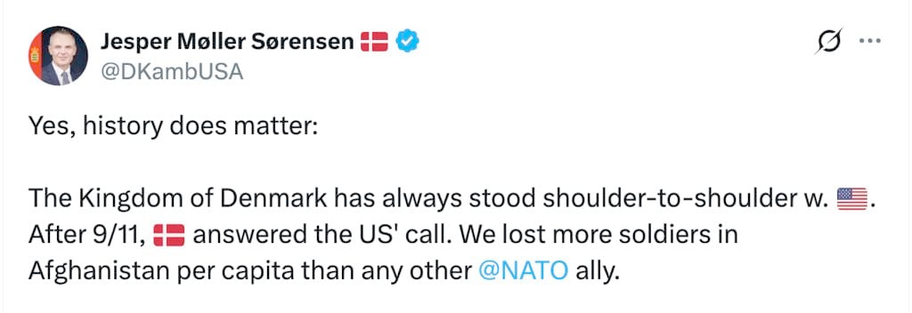 Even worse is the Kingdom of Denmark, which is further up shit creek and furiously peddling bullshit. Their Ambassador to the US, Jesper Moller Sorensen, piously and pathetically said, “The Kingdom of Denmark has always stood shoulder-to-shoulder w. [the USA] After 9/11, Denmark answered the US' call. We lost more soldiers in Afghanistan per capita than any other NATO ally.”